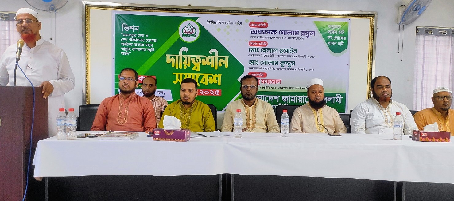 বাংলাদেশ জামায়াতে ইসলামী যশোর জেলার নেতৃবৃন্দ বলেছেন, জামায়াত কোন পার্থিব স্বার্থ হাসিলের জন্য নয়, আল্লাহর জমিনে আল্লাহর আইন প্রতিষ্ঠার জন্য আন্দোলন করছে। এই আন্দোলন বাস্তবায়নের জন্য জামায়াত কর্মীদের মাল ও জান আল্লাহর সন্তুষ্টি অর্জনের জন্য আল্লাহর রাস্তায় নিয়োজিত করতে হবে। শুক্রবার সকালে যশোর শহরের সার্কিট হাউজ পাড়ায় একটি হলরুমে আয়োজিত দায়িত্বশীল সমাবেশে নেতৃবৃন্দ এসব কথা বলেন।