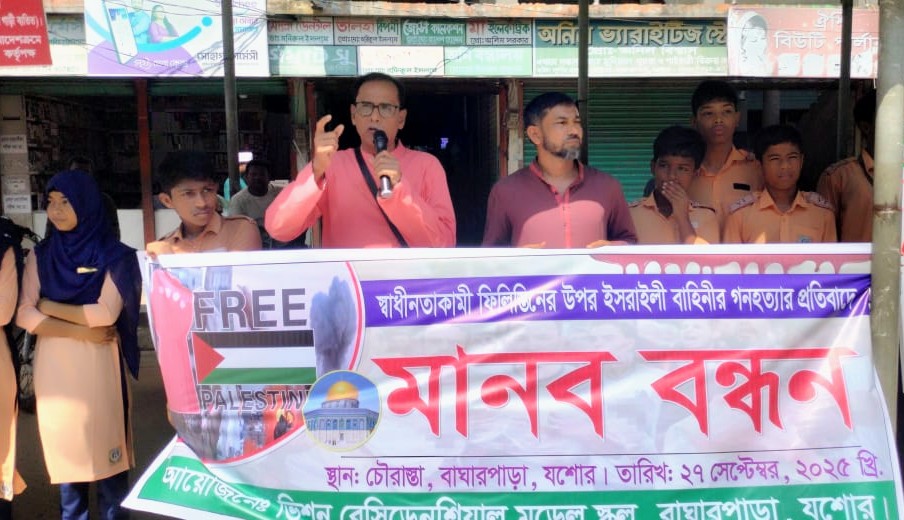 ফিলিস্তিনে স্বাধীনতাকামী জনগণের ওপর ইজরাইলি বাহিনীর গণহত্যার প্রতিবাদে বাঘারপাড়ায় মানববন্ধন অনুষ্ঠিত হয়েছে।শনিবার সকাল ১১টায় বাঘারপাড়া চৌরাস্তা মোড়ে রেসিডেনশিয়াল স্কুলের শিক্ষক, কর্মচারী ও শিক্ষার্থীরা এ মানববন্ধনে অংশ নেন।