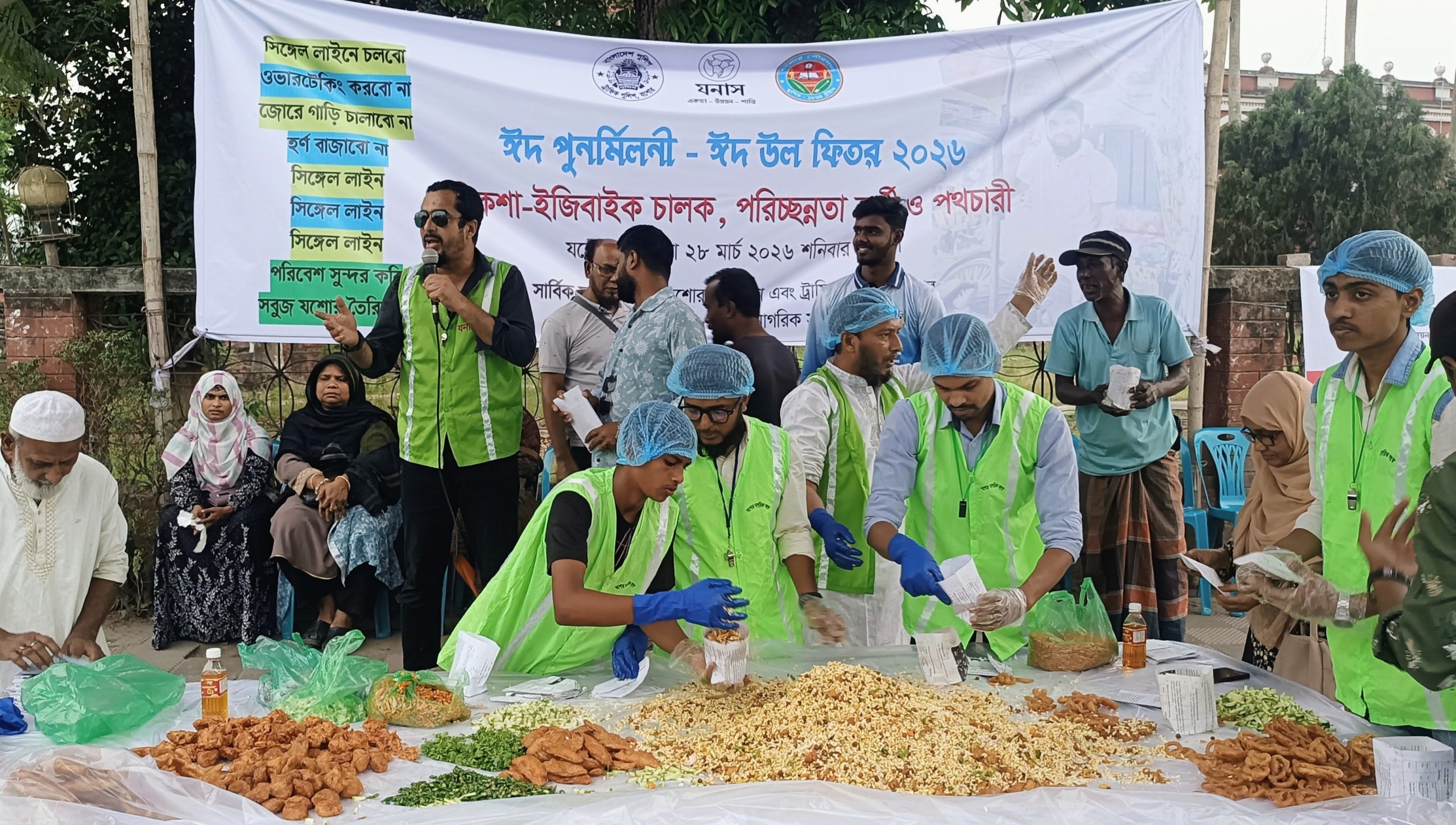 রকমারি সব ভাজাপোড়ার আইটেম- আলুর চপ, পেঁয়াজু, বেগুনী ভেঙে চুরমার করে মিশিয়ে দেওয়া হচ্ছে মুড়ির সঙ্গে। হাতগুলো সব চলছে ক্ষিপ্র গতিতে। দ্রুত হাতে ছোলা-মুড়ি, চানাচুর ও ভাজাপোড়া মিশিয়ে ঠোঙা-ভর্তি করে রিক্সা, ভ্যান ও ইজিবাইক চালকদের হাতে তুলে দিচ্ছেন স্বেচ্ছাসেবকেরা। চলতি পথে সারি বেঁধে লাইনে দাঁড়িয়ে ঈদ পুর্নমিলনী অনুষ্ঠানের আপ্যায়ন গ্রহণ করছেন চালকেরা। পথচলতি পথিকেরাও আপ্যায়ন থেকে বাদ যাচ্ছেন না। এমন দৃশ্য যশোর নাগরিক সংঘ আয়োজিত ঈদ পুর্নমিলনী অনুষ্ঠানের।