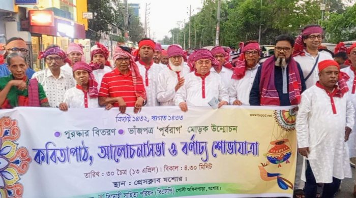 আহবান নিউজ২৪ : ১৪৩২কে বিদায় এবং ১৪৩৩কে স্বাগত জানিয়ে যশোরের বিদ্রোহী সাহিত্য পরিয়দের উদ্যোগে সোমবার বিকেলে (বিএসপি) বর্ণাঢ্য শোভাযাত্রা বের হয়। শোভাযাত্রাটি প্রেসক্লাব যশোরের সামনে থেকে শুরু হয়ে প্রধান প্রধান read more